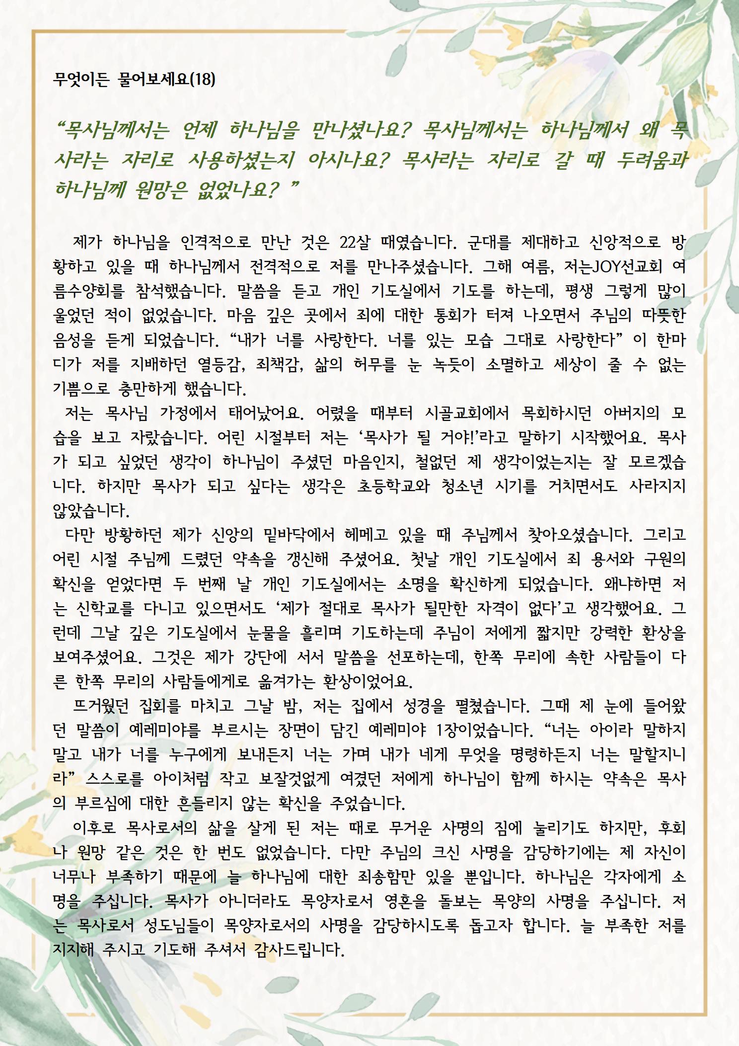 무엇이든 물어보세요(18) “목사님께서는 언제 하나님을 만나셨나요? 목사님께서는 하나님께서 왜 목사라는 자리로 사용하셨는지… 행정실 2025-10-31 행정실 0 4 10.31 15:59