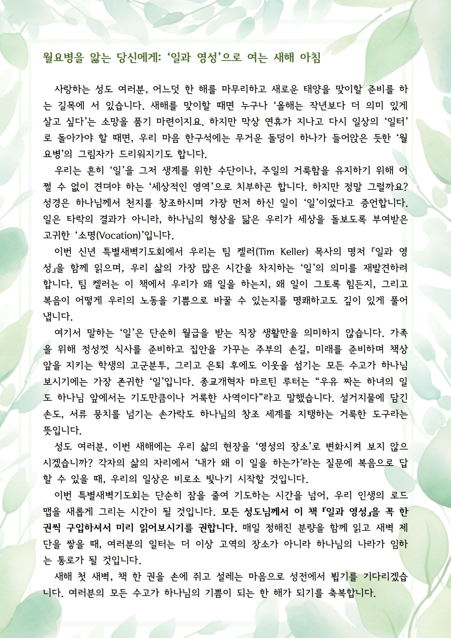 월요병을 앓는 당신에게: ‘일과 영성’으로 여는 새해 아침